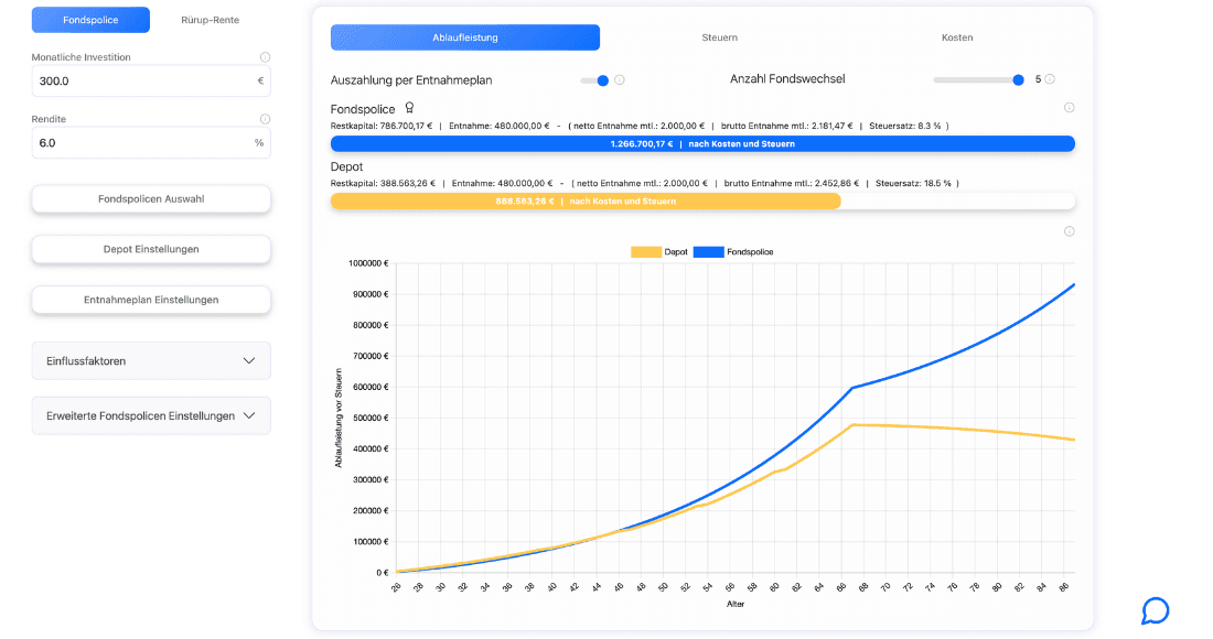 Überzeuge deine Kunden mit nur wenigen Klicks – durch die visuelle Darstellung aller relevanten Einflussfaktoren zeigst du klar, warum die Fondspolice die bessere Wahl ist.